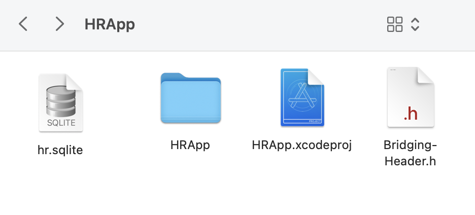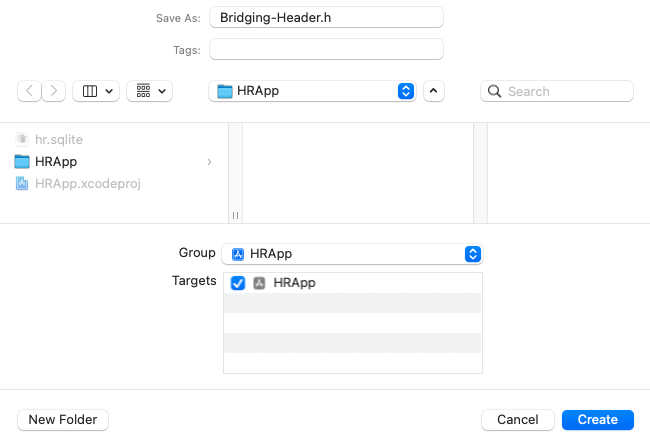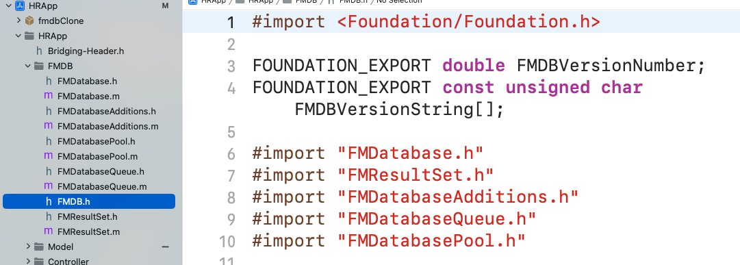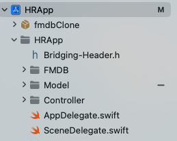 이렇게 FMDB.h를 import했음에도 불구하고 외부 라이브러이의 인터페이스가 선언되지 않는 경우가 있다. 이 경우 브릿징 헤더파일을 .xcodeproj 파일이 있는 프로젝트의 기본 루트에 두어야 한다.