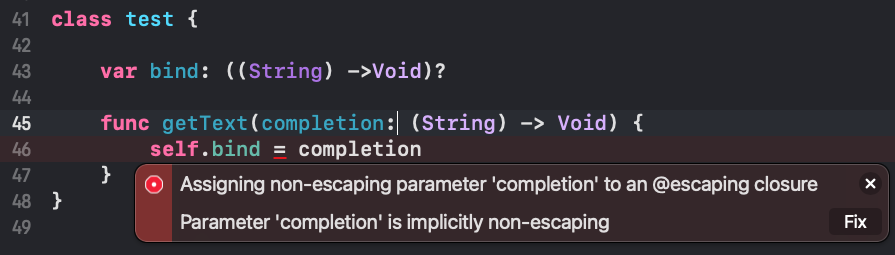 이 경우에도 마찬가지입니다. bind 프로퍼티에 completion의 클로저를 저장하기 때문에 getText()함수가 종료된 후에도 저장된 클로저가 사용될 수 있는데 non-escaping클로저는 getText()함수의 호출 이후 소멸되기 때문에 escape의 가능성이 있습니다. 따라서 @escaping 키워드를 사용해야 합니다.