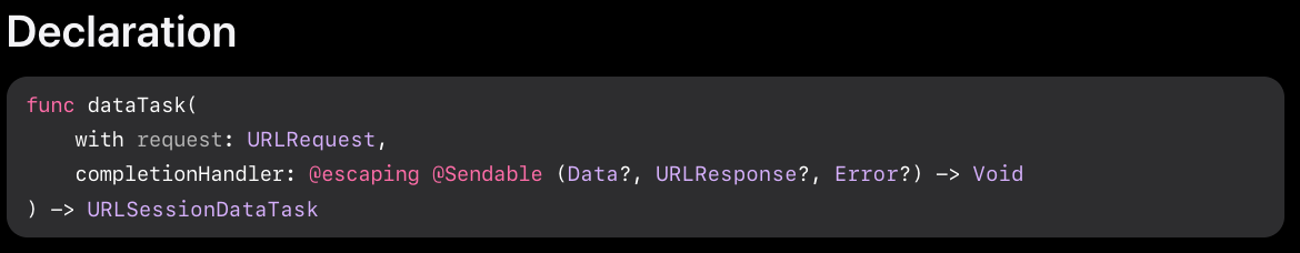그 이전에 URLSession의 dataTask함수의 두번째 매개변수인 completionHandler 또한 @escaping 클로저 매개변수입니다. completionHandler는 request 요청이 완료 되었을 경우에 비로소 completionHandler 클로저가 실행이 됩니다. " 그럼 task에 URLSessionDataTask 반환하기 전에 이미 클로저 실행하고 task에 값을 치환 하는게 아닌가??" 아닙니다! URLSessionDataTask는 또한 중요한 특징이 있습니다. URLSession또한 포함이 되는데 resume() 메소드를 호출해야만 task가 실행이 됩니다. 즉 resume()를 호출해야만 비로소 url을 통해서 요청 데이터를 서버로부터 받아오는 작업을 합니다. 그 이전까지는 suspend() 상태로 존재합니다.(== completion()함수 사용x) task 실행 시점은 위 코드에서 주석 1,2 표시 이후 task.resume()에 비로소 dataTask(with:completionHandler:)가 작업을 시작합니다. 그 후 데이터가 로드된 후에 completionHandler를 반환합니다. 근데 completionHandler는 asynchronous한 절차를 거친 이후에 반환됩니다.
