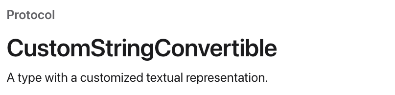 특정 type을 textual한 표현으로 커스텀해주는 protocol입니다. type이란? 내가 만든 커스텀의 구조체, 클래스, 클래스 등의 타입을 의미합니다. 특정 object를 print(_:)로 출력할 때, CustomStringConvertible protocol을 채택 후 내부 instance인 description을 커스텀 했다면 String(describing:)을 통해 어떤 type이든 string으로 변환시켜줍니다. 주의할 점은 이 프로토콜을 채택한 후에 프로토콜의 instance를 바로 쓰거나 일반 제약조건로 쓰는 것은 비 추천 한다고 명시되어 있습니다.