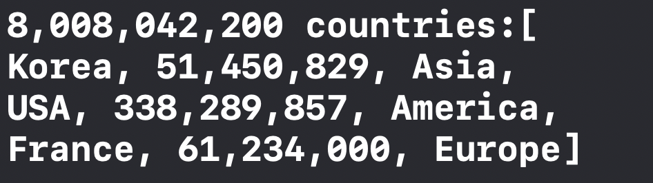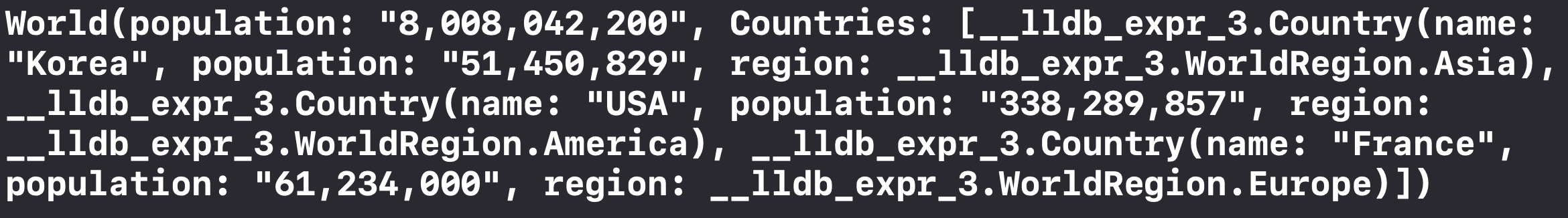 World 객체는 디폴트 형식으로 출력이 되었습니다. World객체는 내부 객체인 Countries를 인스턴스로 갖고 있습니다. 이때 World의 internal name __lldb_expr_3.Country에서 __lldb_expr_3은 Swift modul's 이름입니다(Not error). 모든 클래스는 Swift module에 속해 있습니다. 특정 객체의 내부 인스턴스 이름은 ModuleName.객체명 으로 지정됩니다. ( 플레이그라운드일 경우. 앱의 경우는 AppName.Object명)
