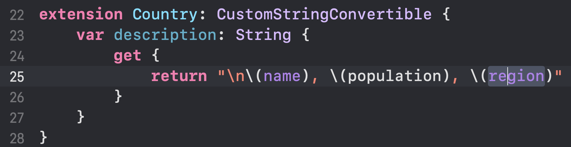 물론 WorldRegion의 타입을 String으로 지정하는 방법도 있겠지만 CustomStringConvertible 프로토콜을 채택하면 간결하게! 사용할 수 있다는 장점이 있습니다.