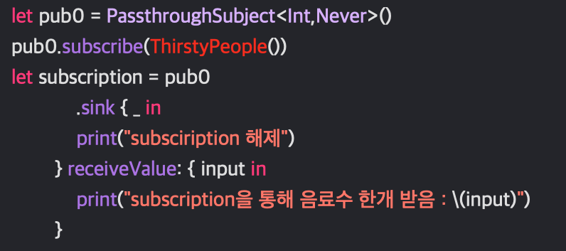 이와 같이 커스텀 subscriber를 등록한 후에 sink(_:) 함수를 사용할 수도 있습니다.