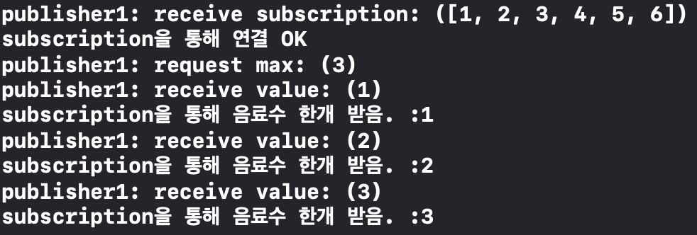 초기에 Publisher와 Subscriber가 연결될 때, receive(subscription:)의 인자값 subscription의 subscription.request()를 통해 publisher가 pubilsh 할 수 있는 값을 몇 개 받을지 지정 할 수 있습니다. 이때 subscription과 최초 연결 되었다는 코드를 작성함으로 Publisher와 Subscriber가 연결 되었음을 알 수 있는 코드도 작성할 수 있습니다.