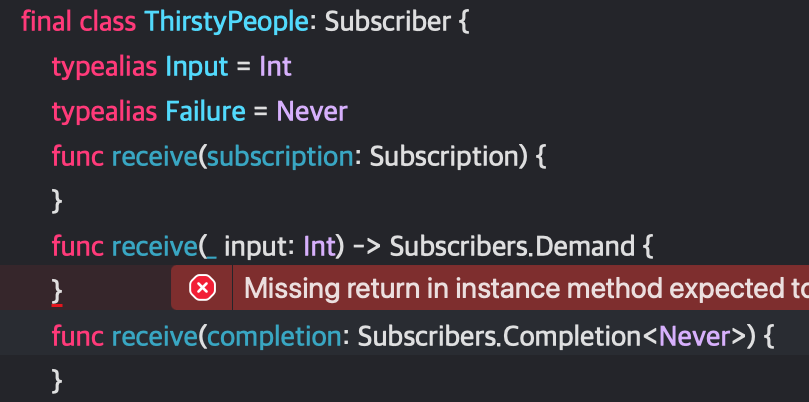 기본적으로 Subscriber를 커스텀해서 만든다고 한다면 Publisher's <Output, Failure> Generic type 과 일치하는 Input,Failure타입을 선언해야 합니다.