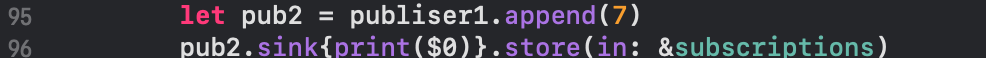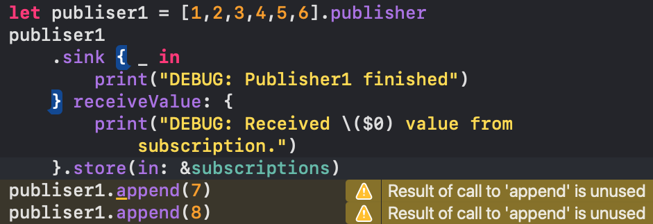 publisher1.append(7)의 경우 새로운 Publishers.Sequence<[Int], Never> 타입의 publhiser를 반환합니다. 이를 따로 subscriber에게 구독 후 값을 출력해야 합니다..