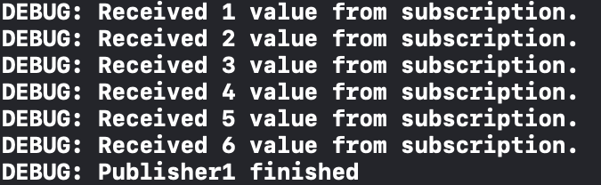 간단한 예입니다. publisher1과 publisher2 같은 경우 자신이 갖고 있는 값을 전부 subscriber에게 전송 했다면 completion event를 전송합니다. 물론 글의 후반부에 CurrentValueSubject를 통해서도 [1,2,3,4,5,6]에 대해 선언하고 다루며 차이점을 설명할 것입니다.
