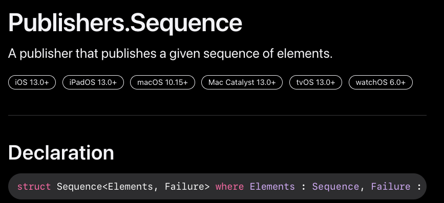 Publishers.sequence타입 입니다. 배열에 ". publisher"를 chain으로 연결할 경우 non-Combine framework의 요소인 sequence의 elements는 Publishers.Sequence의 "Elements"가 generic type로 초기화됩니다.(배열 -> Elements) Elements.Element는 Output type입니다.