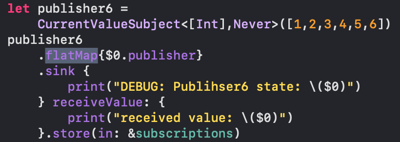 let publisher6 = CurrentValueSubject<[Int],Never>([1,2,3,4,5,6])