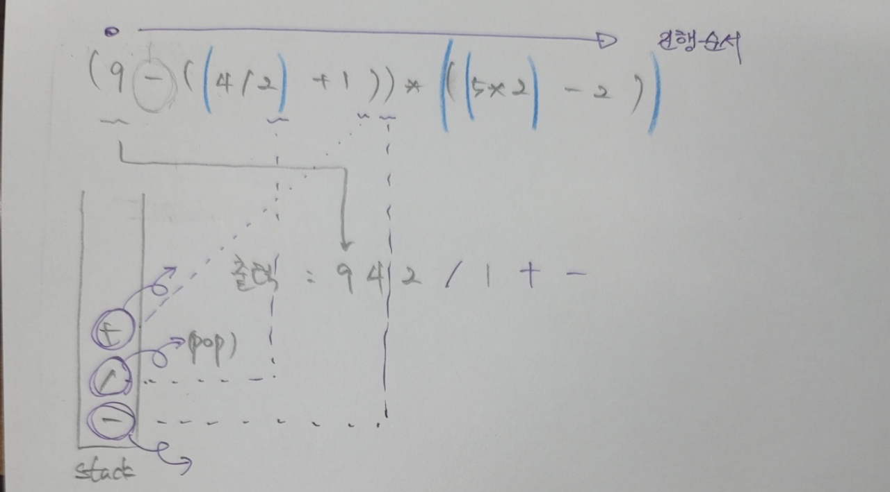 순차적으로 왼쪽에서 오른쪽으로 식을 읽어갈 때, 피 연산자는 출력하고, 연산자는 stack에 따로 push 합니다. 이후 오른쪽 괄호가 나오면 top의 영역에 위치한 element를 pop합니다.