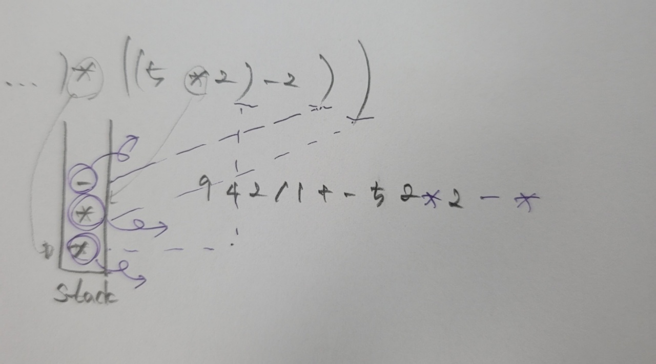 - 연산자를 만나면 연산자의 연산에 필요한 만큼의 피연산자를 스택에서 pop하여 연산하고, 연산 결과를 다시 스택에 push 합니다. 저는 이때 연산 결과를 치환해서 스택에 push합니다. 참고로, 덧셈 연산자가 결과를 갖기 위해서는 두개의 피연산자가 필요합니다. ex) 1 + 3 . ex) 4 + //연산자1, 피연산자1 수식은 계산 불가입니다.