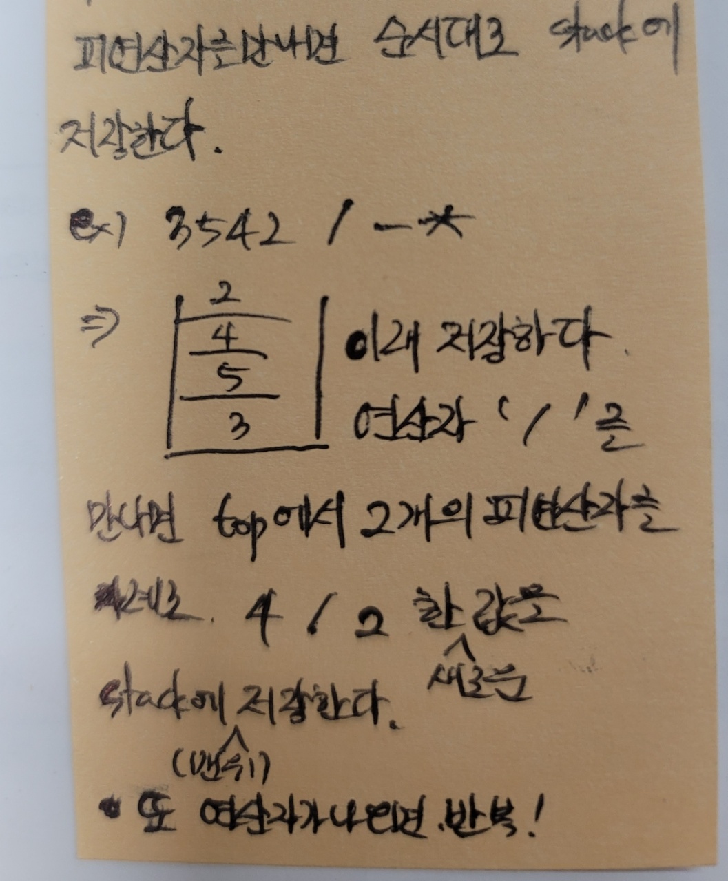 피연산자는 스택에 push합니다. 연산자를 마주하면 필요한 만큼(거의,, 연산에 필요한 두 개의 피연산자) 피 연산자를 pop해서 계산하고, 다시 스택에 push합니다. ( 반복 )