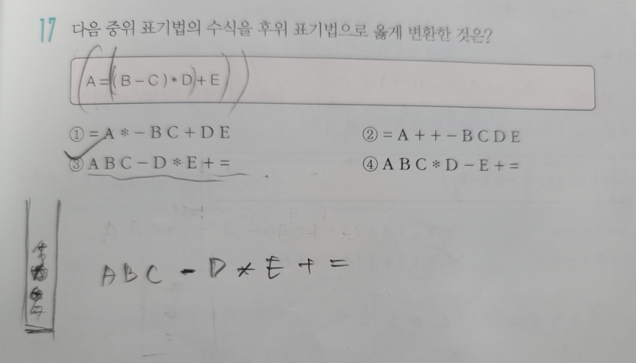 - 중위 표기식에서 연산자, 피연산자 간 연산의 우선순위를 괄호로 묶습니다. (예를들어, 우선순위는 덧셈보다 곱셈이 우선순위가 높습니다.) 이를 괄호로 묶는 형태가 가장 중요합니다.