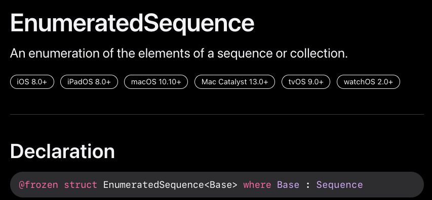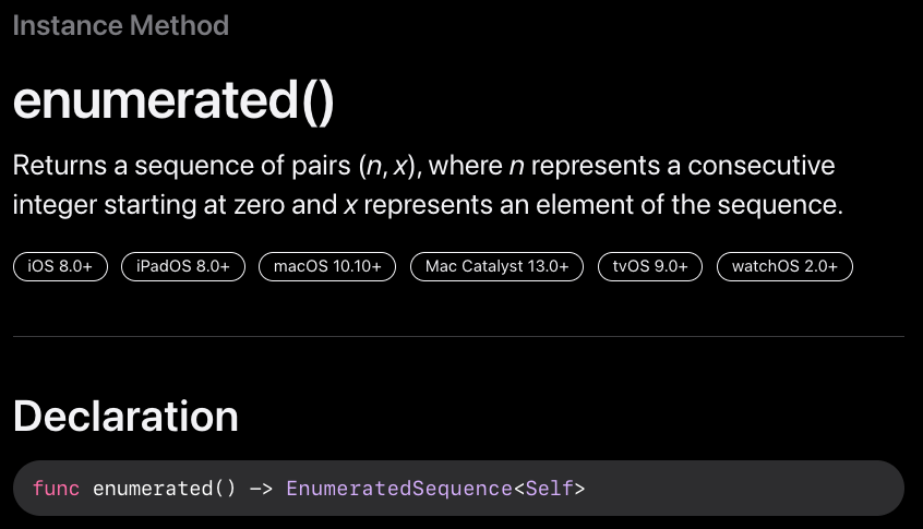 여기서 $0은 (offset, element) 를 반환하고 element는 Sequence의 원소, offset는 해당 element의 index를 반합니다.