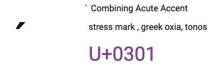 Unicode의 상징을 뜻하는 U+가 붙고 연이어 숫자(Unicode code point 숫자는 code point로 표현)가 붙습니다.(LG U+아닙니다) 즉 U+0301은 유니코드라는 것을 알 수 있고 combining acute accent를 표현합니다.