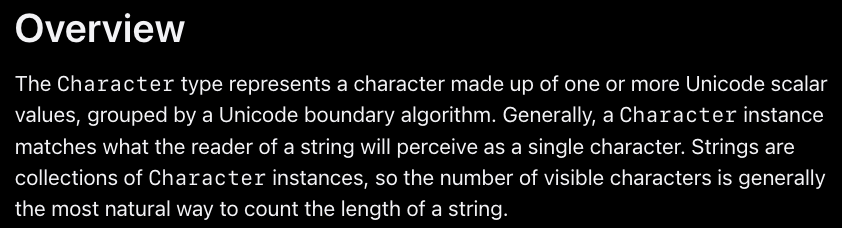 Character의 설명입니다. 한개의 Character 타입을 표현하기 위해 한 개의 character는 한 개 또는 여러 개의 Unicode scalar값으로 만들어 집니다. 즉 Character로 구성된 collection 덕분에 String은 자연스러운 문자열 크기를 반환받을 수 있습니다.