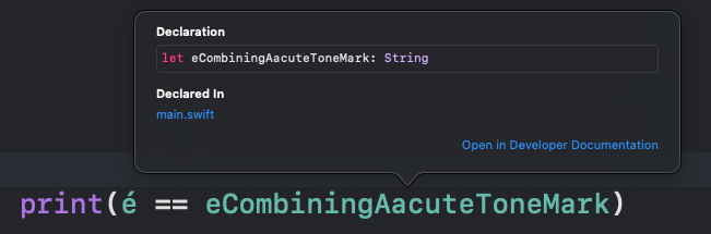 이 둘은 String으로 타입 추론 됩니다. 위에서 말했지만 String은 Characters collection으로 구성됩니다. collection을 구성하는 각각의 character는 one Unicode scalar or Unicode scalar values.. 한개 또는 여러개의 유니코드 스칼라값으로 이루어집니다. 하지만 한개 또는 여러개의 Unicode scalar value로 이루어진 것이 Character입니다. 그래서 Character의 비교시에는 같다고 출력됩니다.
