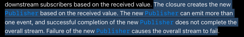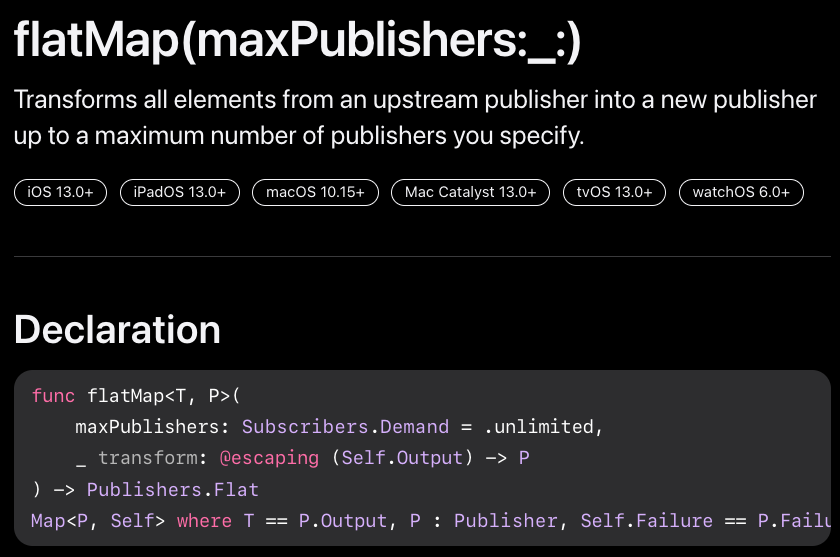 이때 flatMap(_:)을 사용하면 됩니다. (마찬가지로 에러 처리 포스트에서 다뤘지만 한번 더..) 잠시 flatMap(maxPublihsers:_:)의 특징을 간단히 설명하겠습니다.