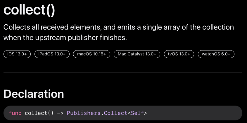 그리고 Swift standard library에 속한 함수들과 이름이 같은 함수들이 많은데 실제로 동작 원리와 정말 유사합니다. 하지만 차이점이 있다면? 바로 publisher 반환 유무입니다.