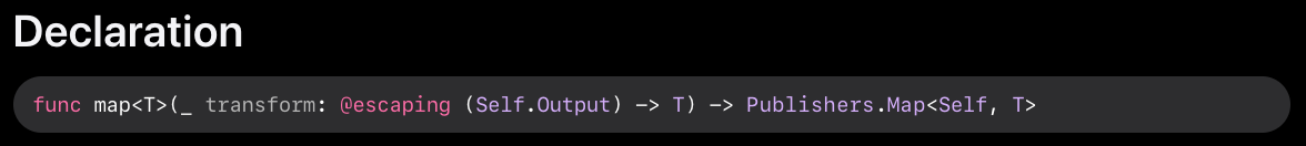 다시, 위에서 정의된 고차함수 map(_:)을 보면,, map(_:) operator과의 차이점이 배열 반환 vs publisher 반환임을 명확하게 알 수 있습니다.