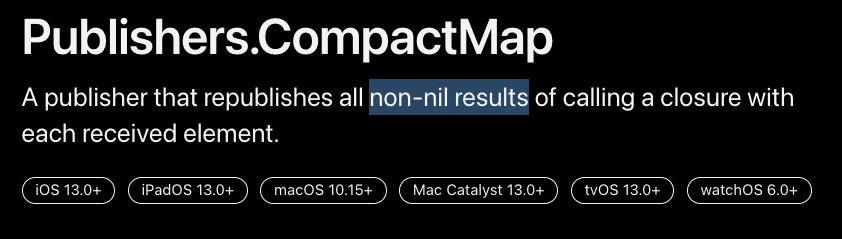 그렇다면 compactMap(_:) operator는 무엇인가? upstream publihser의 sequence 한 elements에 대해서 nil이 있는 경우 nil을 제거한 elements만 downstream으로 값을 방출합니다.