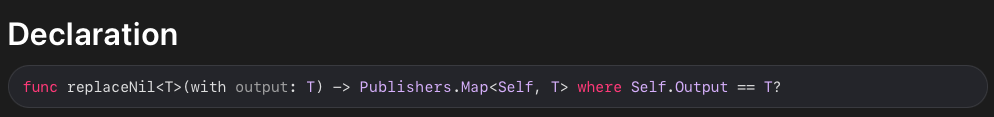 이 둘의 공통점은 upstream publisher로부터 publish 된 값이 nil을 갖게 된다면 다른 값( 준비해 둔 기본값)으로 대체할 수 있는 operator입니다. 즉 nil이어도 항상 replacing operator를 사용해 항상 값을 downstream subscriber에게 publish 할 수 있습니다.