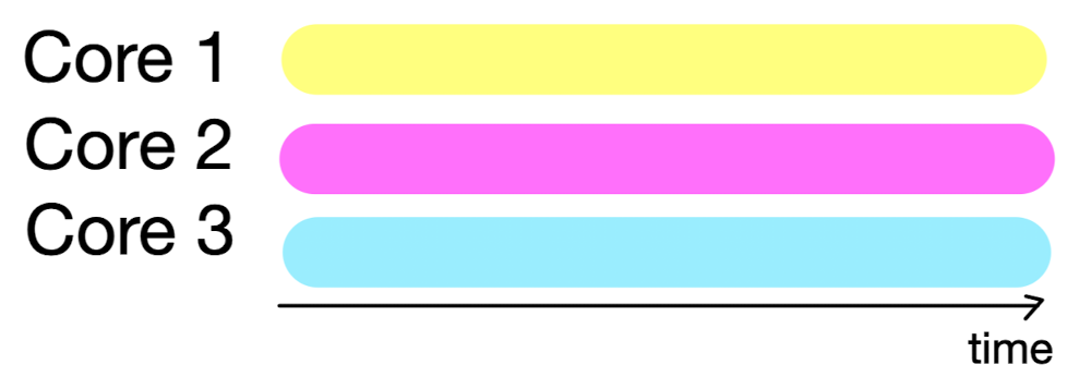 각 라인을 task로 칭한다면, 특정 time에 core1, core2, core3의 한 개 또는 여러 개의 thread가 실행되면서 task들이 동시에 수행됩니다.