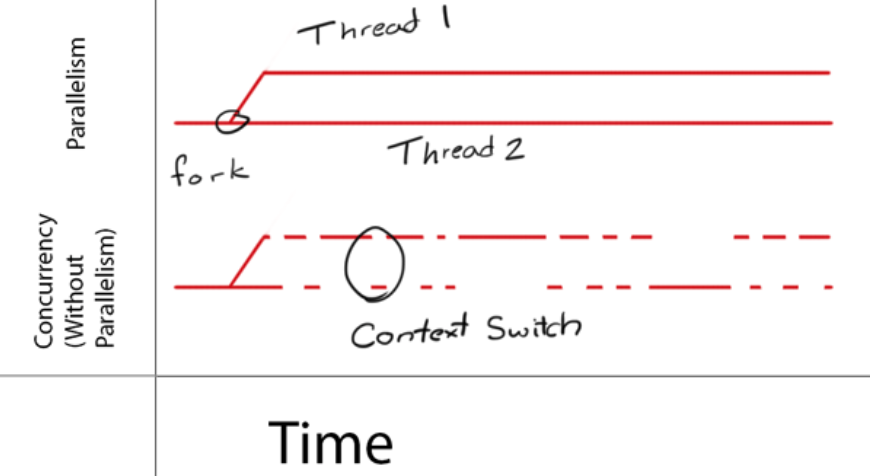 parallelism은 Thread1, Thread2가 동시에 수행됩니다. 하지만 Concurrency를 보면 Thread1, Thread2가 context switch를 통해 번갈아가면서 수행됩니다. 물론 cpu는 정말 빠르기 때문에 동시에 처리되는 것처럼 보일 수 있습니다.
