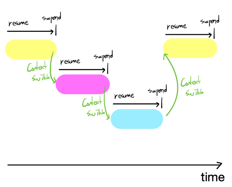 A task가 실행 ~ 중지 -> B task 실행 ~ 중지 ... 각각의 task가 time slicing의 특정 시간대에 맞춰 번갈아가면서 실행됩니다. 이때 task와 다른 task 간 context switch가 발생합니다.