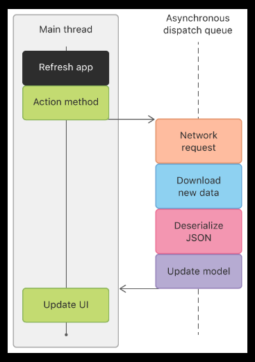서버로부터 받는 다량의 데이터, network, image processing등의 작업은 시간을 비교적 오래 소모합니다. DispatchQueue main은 serial queue입니다. 특정 시간대에 하나의 task만 수행할 수 있습니다. 이런 작업 모두 main thread에서 담당한다면 앱의 반응성은 낮아집니다. UI가 느려지거나 중지될 수 있습니다. 사용자의 기분은 다운됩니다. -> 앱 삭제 읗..