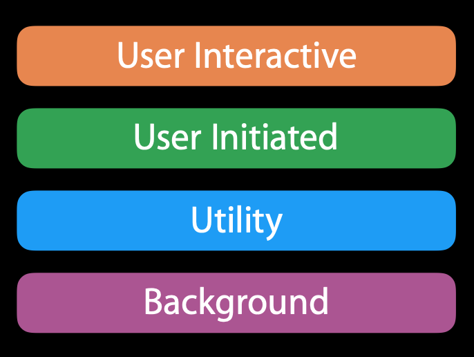 User Interactive가 우선순위가 가장 높습니다. Background는 가장 낮은 우선순위에 해당합니다. WWDC에서 소개된 4개의 우선순위 외에도 두 가지 종류의 QoS가 있습니다. 그중 default는 User Initiated, User Interactive보단 낮고 Utility, Background보단 높습니다.