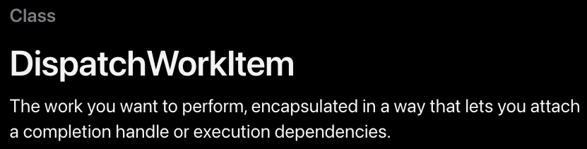 GCD의 task를 효율적으로 다루고 수행하기 위한 개념 DispatchWorkItem. class입니다. DispatchWorkItem을 사용해 캡슐화를 해서 dispatch queue나 dispatch group에 추가해서 캡슐화된 task를 수행하는 개념입니다. DispatchSource event, registration, cancel관련 처리를 할 수 있습니다.