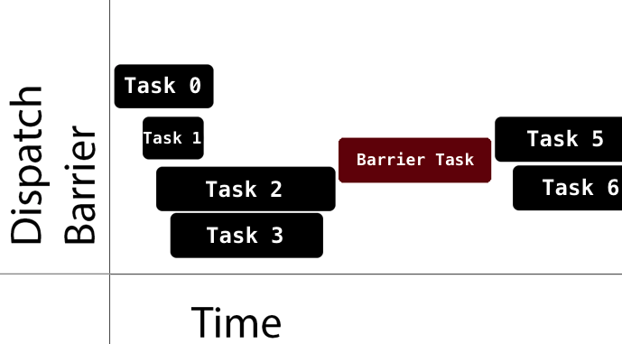 Barrier의 경우 GCD. concurrent 수행에서 일어날 수 있는 shared resource를 동시에 읽으면서 쓸 때의 문제가 발생할 사용됩니다. + 싱글톤을 만들 경우에도 사용됩니다. barrier를 통해 concurrency 상황에서 특정한 task만 serial하게 실행시키도록 할 수 있습니다. barrier를 사용해서 한 개 또는 여러 개의 task에 대해 dispatch queue에서 sync한 수행을 하도록 사용할 수 있습니다. concurrency queue에서 사용해야 합니다. 여러 개의 task가 동시에 실행되는 dispatch's concurrent queue에서 DispatchWorkItem의 barrier task가 추가된다면 barrier 이전에 수행되던 task가 전부 실행 될 때까지 barrier task의 실행을 지연합니다. Barrier이전의 task가 전부 실행되면 비로소 단독으로 barrier task가 실행됩니다. Barrier task가 실행될 때에 한해서만 serial queue처럼 동작합니다. Barrier task가 끝나면 다시 concurrency하게 task들이 수행됩니다.