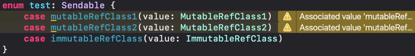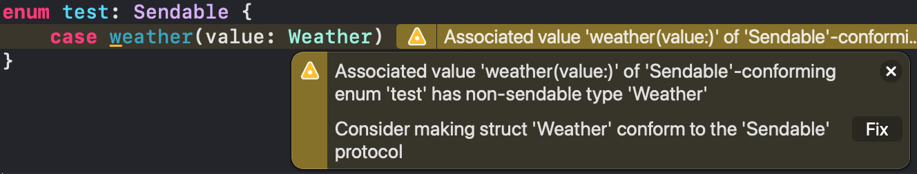 test enum은 Sendable을 준수해야 하기 때문에 case 안에 담길 값 또한 Sendable을 준수해야 합니다. 하지만 Weather의 경우 Sendable을 준수하지 않기 때문에 경고가 경고 메시지가 나타납니다.