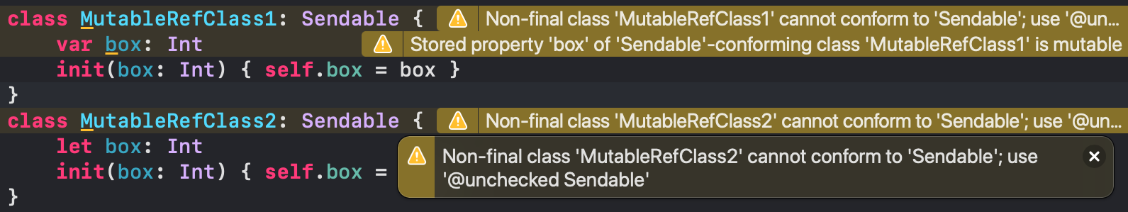 결국 cross actor간 access되는 actor-isolated 함수 의 인자값 등으로 사용될 경우 thread-safety를 보장하지 않습니다. sendable을 준수하지 않기 때문입니다.