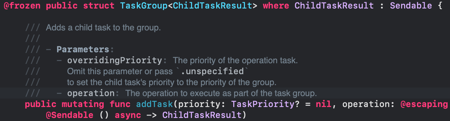 TaskGroup에 여러 개의 동시에 실행되야 하는 task들을 addTask로 추가합니다. 이때 group에 추가된 각각의 task들은 priority를 갖고 있으며 부여하지 않을 경우 상위 객체의 priority를 상속받습니다. 중요한 것은 addTask에 task를 추가하는데 이 함수는 actor에서도 사용될 수 있습니다. 그렇기 때문에 Sendable을 준수하고 있습니다.