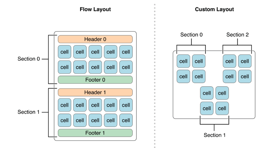 Items를 grid 형식으로 배치할 수 있고, optional로 header, footer를 지원합니다. 또한 default size로 cell의 최소 사이즈를 지정합니다. 동시에 한 라인에 대해서 interitem 간 minimum spacing과 line 간 minimum spacing을 지원합니다. 위에서 보는 그림처럼 각 section마다 header, footer를 가지고 cell들의 디폴트 size도 적용되며 cell 간 spacing 또한 적용이 됩니다. 이에 관련된 것은 이전 포스트에서 잠깐 다뤘었습니다.
