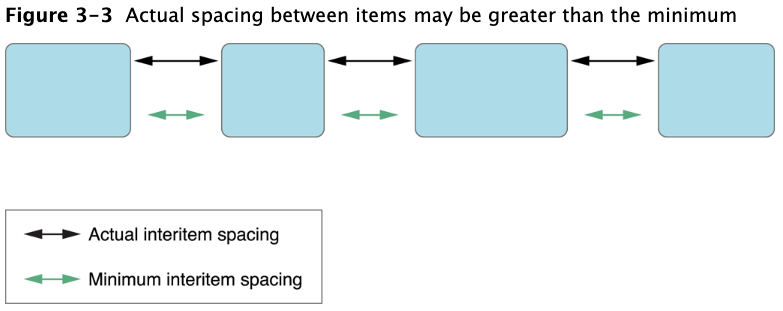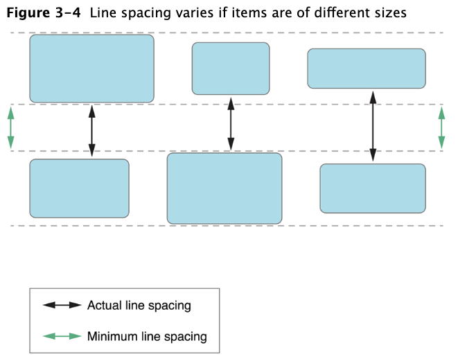 만약 items size가 같을 경우 minimum line spacing value를 존중해 주고, line안에 있는 items 간 spacing은 균등하게 spaced되어 화면에 draw됩니다. 만약 items간 size가 다를 경우 actural spacing은 다를 수 있습니다.