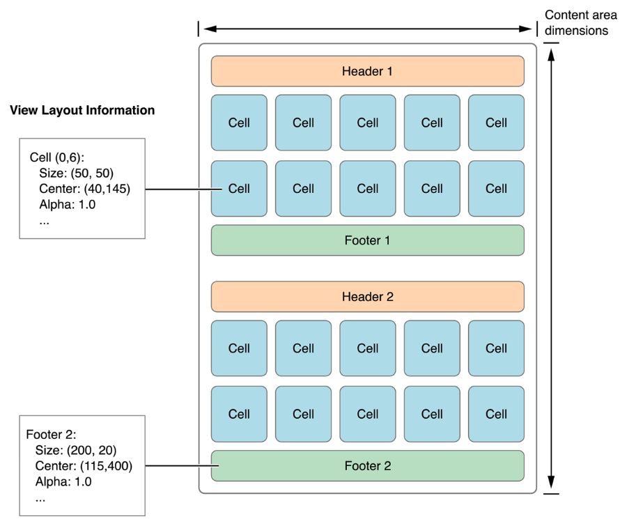 - Supplementary views(header, footer...) 이들은 optional입니다. 마찬가지로 layout object에 의해 배치가 관리되며 flowLayout의 경우 header, footer를 지원합니다. 사용자에 의해 선택 지원 x.