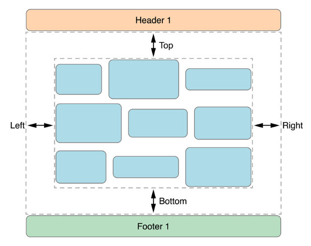 Cell의 size, interitem spacing, line spacing 뿐 아니라 contents를 감싸는 section(header, footer사이)에 대한 inset도 할 수 있습니다. 다만 insets를 적용하면 line에 cells를 배치하기 위해 이용가능한 공간의 양을 줄이기 때문에, line의 cells 개수가 제한될 수 있습니다.