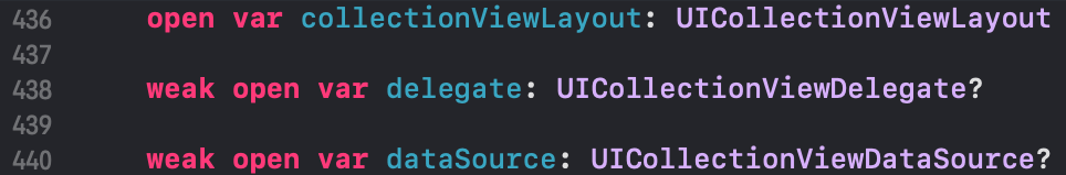 CollectionView의 내부입니다. 3개의 object를 갖고 있는데, collectionView를 구성하기 위해선 dataSource와 layout 인스턴스는 반드시 지정해야 합니다. 특히 layout object(다른 건 옵셔널인데 layout 객체만 옵셔널이 아니기에 초기화 시점에 반드시 초기화되도록 요구됩니다). 그리고 UICollectionView 타입의 객체를 사용할 때 layout지정 없이 코드를 구현하게 된다면 에러가 발생합니다.