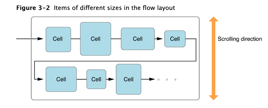 하지만 cells 각각의 size를 다르게 할 수 있습니다. 델리게이트 flow layout 프로토콜을 통해 특정 cell의 size를 IndexPath를 통해 각기 다르게 지정할 수 있기 때문입니다. 이는 비대칭적으로 보이긴 하지만 그럼에도 line 간 minimum spacing은 존재하기 때문에 linear flow를 가집니다. 한 줄의 cell 개수가 다를 수 있습니다.