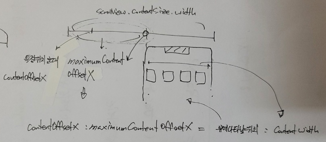 요렇게 contentOffset.x가 maximum인 길이까지를 contentWidth(스크롤 가능한 공간 == scrollView.frame.width) 의 길이로 축소했을 때 나올 수 있는 값을 구해나갑니다.