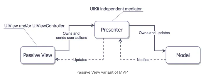 MVP에서 View는 View or viewController입니다. Persenter에는 UIView layout code가 전혀 없습니다. 즉 Presenter는 UIKit에 의존적이지 않습니다. Presenter는 User interaction이나 UI를 업데이트 하고 View의 데이터 전달을 담당합니다(..? ViewModel과 다른점이 뭐지?). View, ViewController를 View layer로 분리했기 때문에, view의 lifecycle에 대해 관여하지 않습니다.