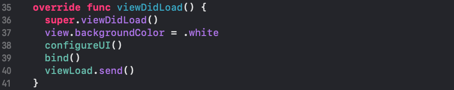 여기서 이 프로토콜의 transform(_:) -> Output 함수는 View와 binding에 사용될 ViewModel의 함수입니다. 단 하나! ViewModel의 역할은 ViewController, View에서 발생하는 event들을 정의한 Inputs 신호가 오면, ViewModel은 신호에 맞게 적절한 로직을 처리합니다. 그리고 UI가 갱신되거나 아무것도 일어나지 않아도 된다는 State를 Output으로 상위 객체(뷰 컨트롤러)에게 전달하는 것입니다. 또는 model의 데이터나 서버에서 받아져 온 모델의 completionHandler를 바탕으로 업데이트 되야 할 View의 새로운 UI State를 ViewModel의 output으로 내보내면 됩니다.