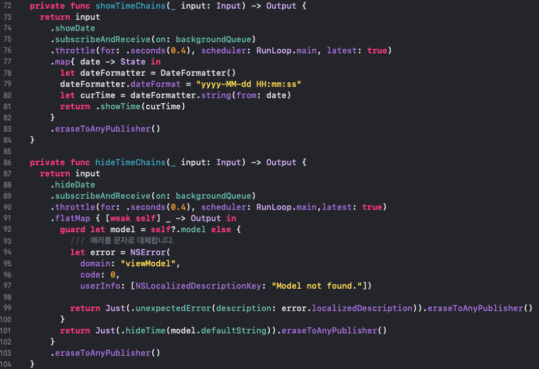 input.showDate 퍼블리셔에서 값이 보내질 때, 한번 버튼을 클릭했을 때 애니메이션이 동작됨으로 값 방출된 이후 0.4초간 동작을 하지 않도록한 후에 showDate 퍼블리셔로부터 전달받은 Date 값으로 "yyyy-MM-dd HH:mm:ss"타입의 string으로 변경 후 다시 view의 State를 .showTime(curTime)으로 anyPublihser타입으로 전달합니다.