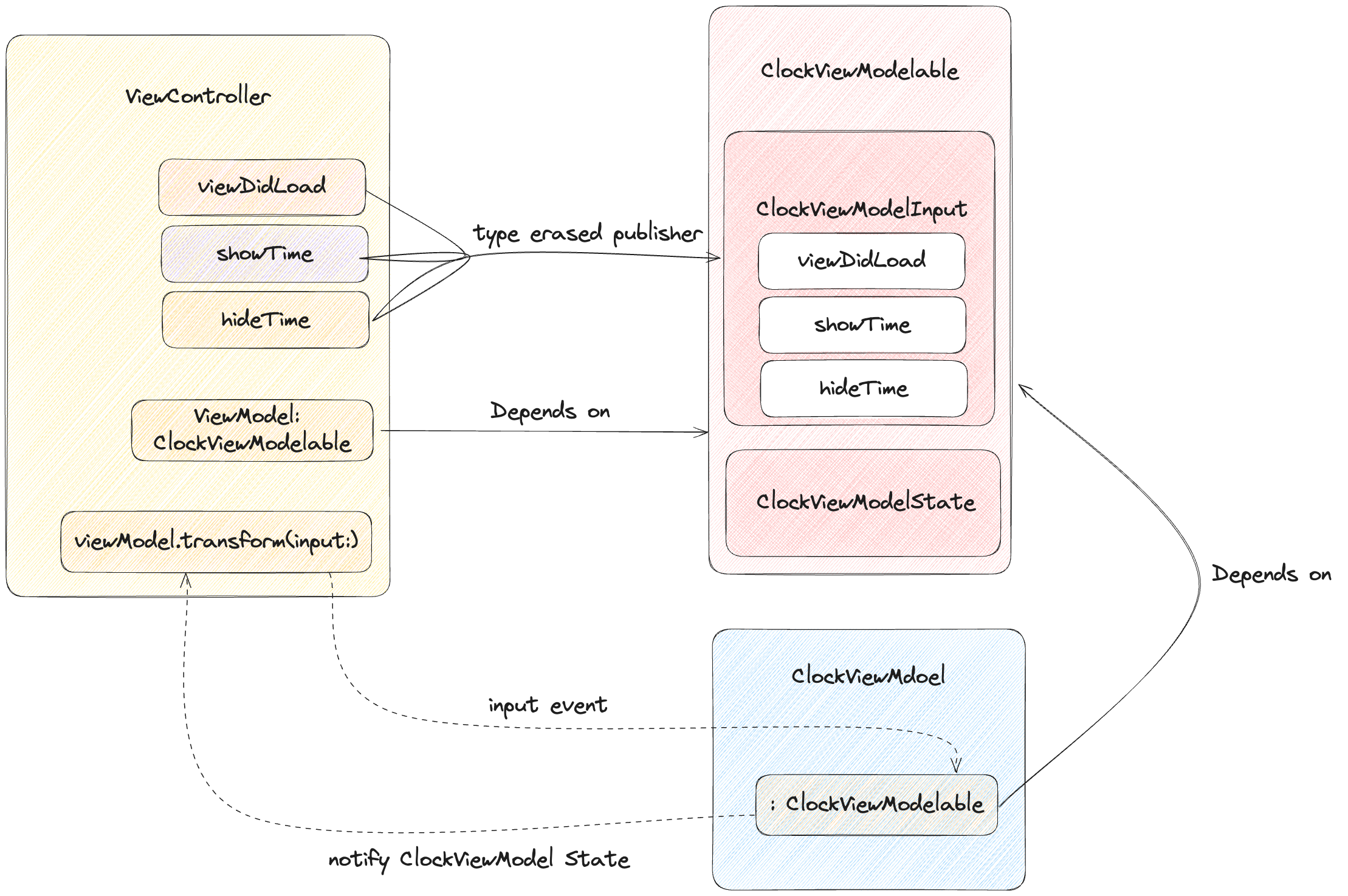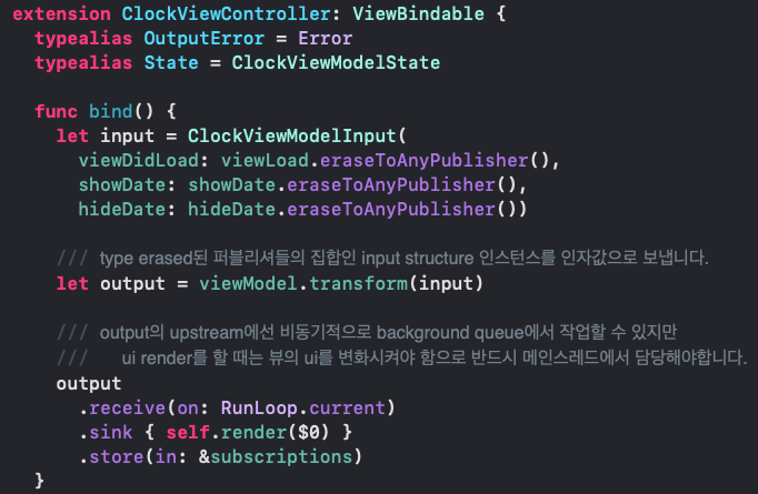 - Input은 위에서 정의한 ClockViewControllerInput ( 3개 퍼블리셔 인스턴스 있음 )으로 제약합니다.