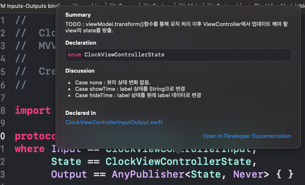 ClockViewModel이 준수할 ClockViewModelable을 선언합니다. 이때 ViewModelable 프로토콜을 상속받습니다. 그리고 위에서 지정한 Input, State를 기반으로 단 하나의 Output publihser를 선언합니다.