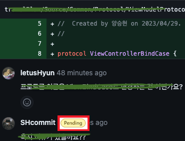 요청사항을 커멘트 받았을 때 저도 답변을 했는데, 상대방한테는 보이지 않았습니다. 제가 단 review옆에는 pending이라는 라벨이 붙어 있었습니다.
