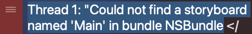 앱의 메인 thread인 Thread 1에서 Main.storyboard 타입의 소스파일을 찾을 수 없다는 에러가 발생됩니다.